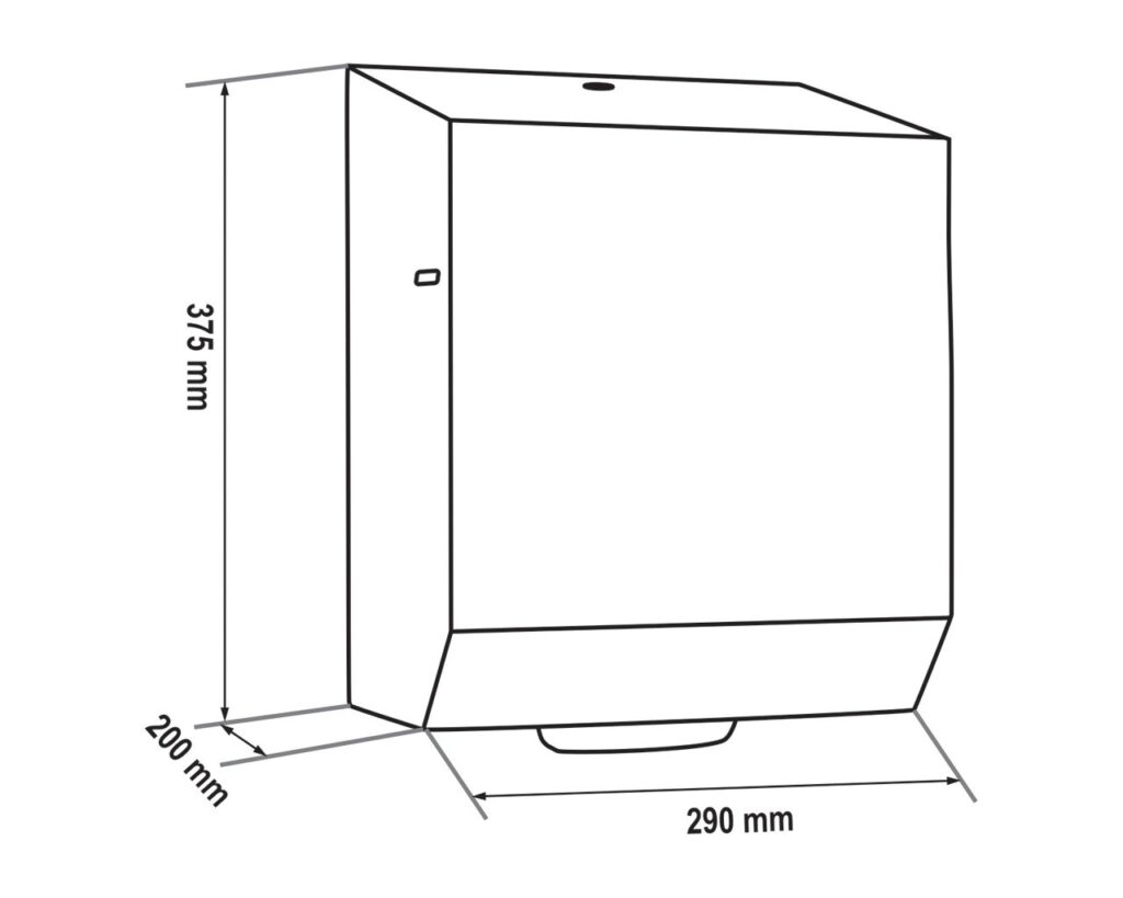 Automatyczny, bezdotykowy podajnik ręczników papierowych w roli zapewnia higieniczne użytkowanie, dotykany jest tylko pobierany ręcznik. Podajnik ręczników zasilany jest 4 bateriami alkalicznymi R20 lub zasilaczem sieciowym. Zasilacz chowany wewnątrz urządzenia w miejscu kasety na baterie, zasilacz można podłączyć bezpośrednio do puszki elektrycznej za urządzeniem (zasilacz kupowany osobno). W urządzeniu łatwo zakłada się nową rolkę papieru z wykorzystaniem wewnętrznego przycisku AUTO FEED do automatycznego nawinięcia papieru na rolki. Diodowy wskaźnik stanu urządzenia, umiejscowiony w dolnej części podajnika, migając na niebiesko sygnalizuje gotowość do pracy, migając na czerwono co 5 sekund sygnalizuje słabe baterie,świecąc stale na czerwono sygnalizuje wyczerpane baterie, migając pulsacyjnie na czerwono sygnalizuje zakleszczenie papieru w urządzeniu. W podajniku jest łatwy dostęp do mechanizmu tnącego umożliwiający bezproblemowe czyszczenie oraz konserwację urządzenia. Podajnik ręczników zabezpieczony jest trwałym stalowym zamkiem bębenkowym. Zamek zlicowany z powierzchnią urządzenia. Łączenia boków podajnika ręczników są spawane i szlifowane. Urządzenie posiada niewidoczne zawiasy, obudowa i tylna ścianka wykonana ze stali nierdzewnej. Zamykany na kluczyk.