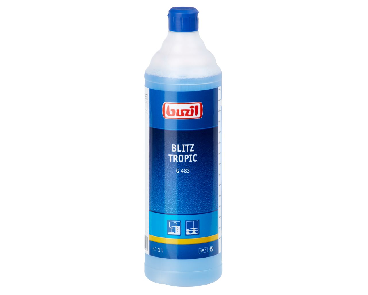 Neutralny, uniwersalny środek do codziennego mycia materiałów, nawierzchni i podłóg odpornych na działanie wody. Stosowany do tworzywa sztucznego, mosiądzu, miedzi, lakierowanych nawierzchni drewnianych, płytek ceramicznych, antypoślizgowych oraz gresu. Skutecznie usuwa zanieczyszczenia po długopisach, mazakach, G 483 Blitz-Tropic wysycha szybko nie pozostawiając smug. Nadaje połysk i pozostawia na czyszczonej nawierzchni świeży zapach owoców tropikalnych.