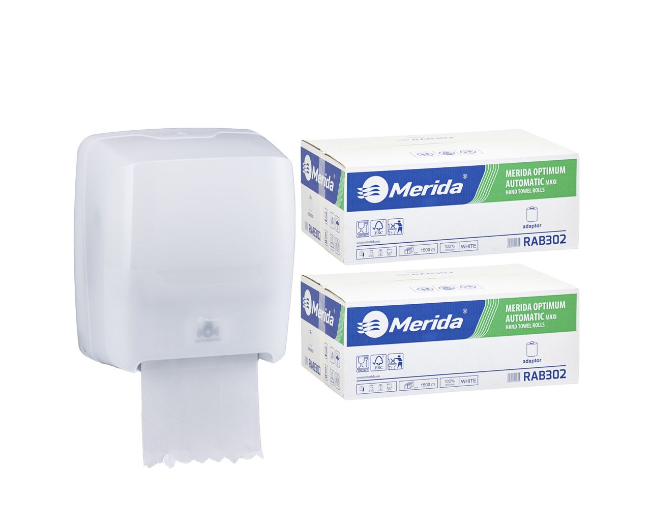 Mechaniczny podajnik ręczników MERIDA HARMONY za 75 zł netto przy zakupie 2 kartonów ręczników MERIDA OPTIMUM AUTOMATIC RAB302 (12 x 250 m = 3 000 m11 100 listków)