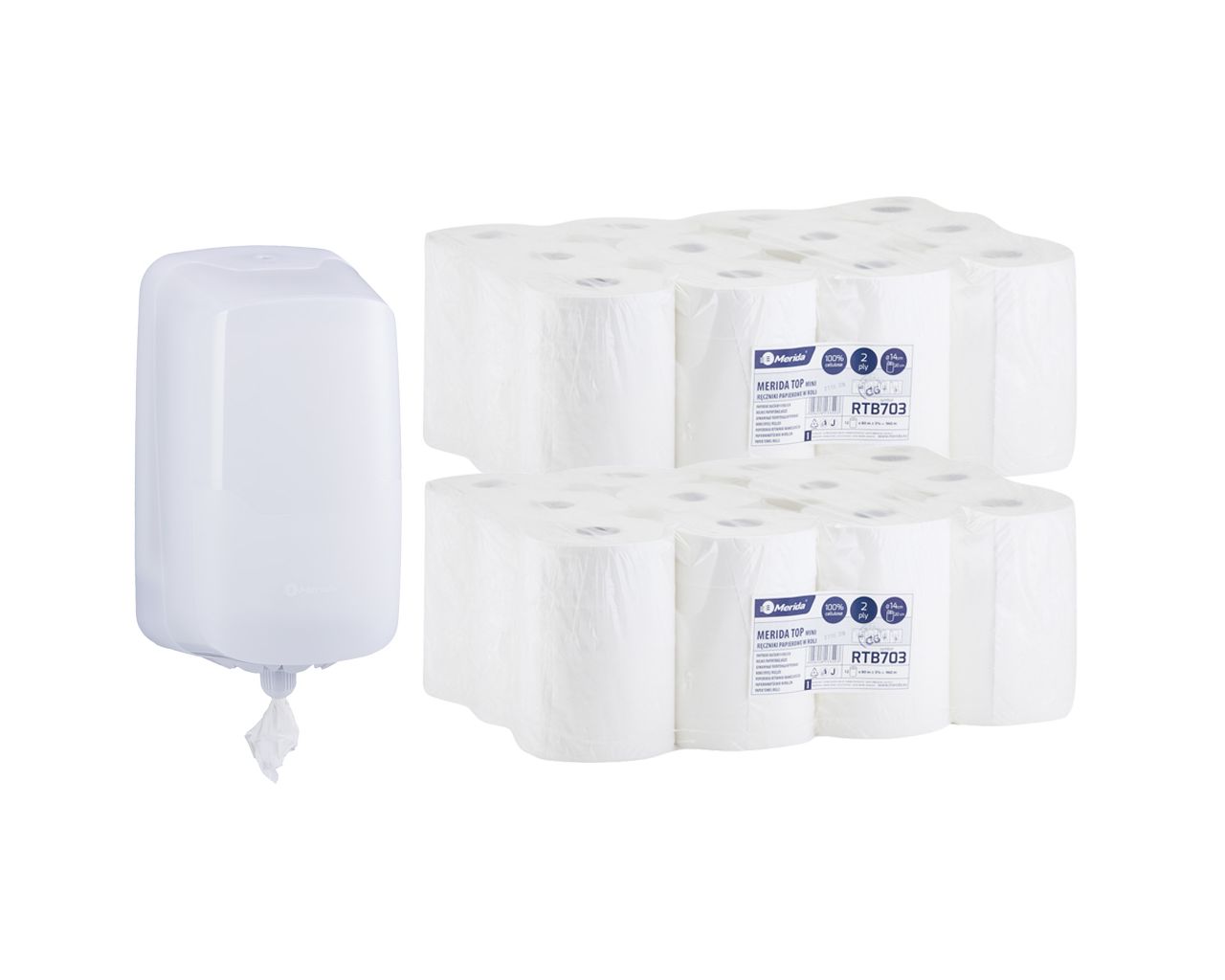 Pojemnik na ręczniki w roli z linii MERIDA HARMONY MINI za 25 zł netto przy zakupie 2 opakowań ręczników w roli MERIDA TOP CENTER PULL MINI RTB703 (24 x 80 m = 1 920 m5 472 listków)
